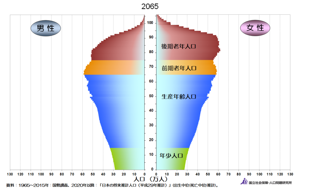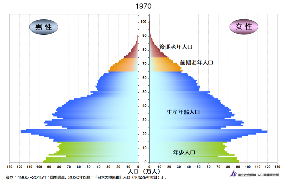 以下は1970年から2025年、2065年の人口ピラミッドの図になります。